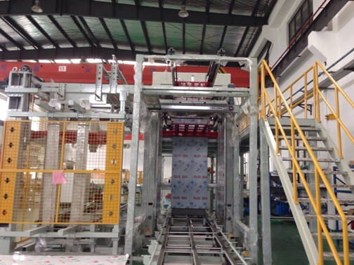 該設備主要用于對食品飲料行業、化工行業中各類瓶罐箱包進行裝入或取出周轉箱。碼垛機自動運行分為自動進箱、轉箱、分排、成堆、移堆、提堆、進托、下堆、出垛等步驟。